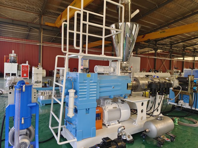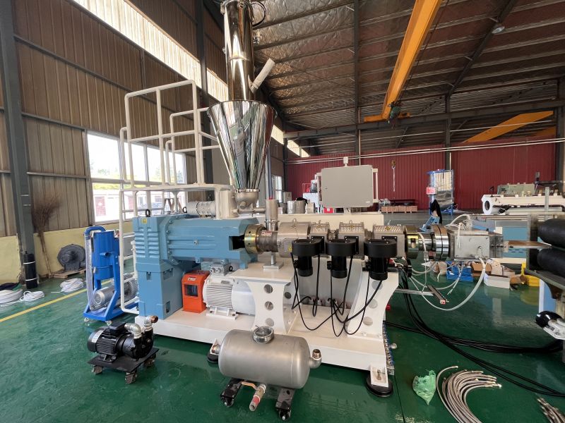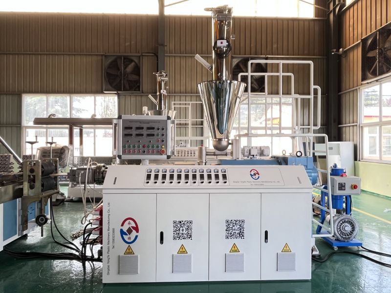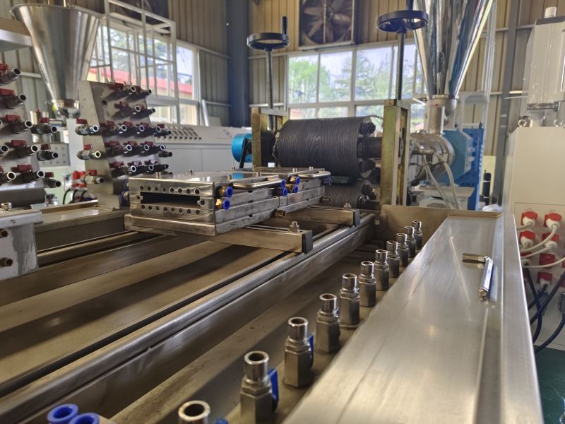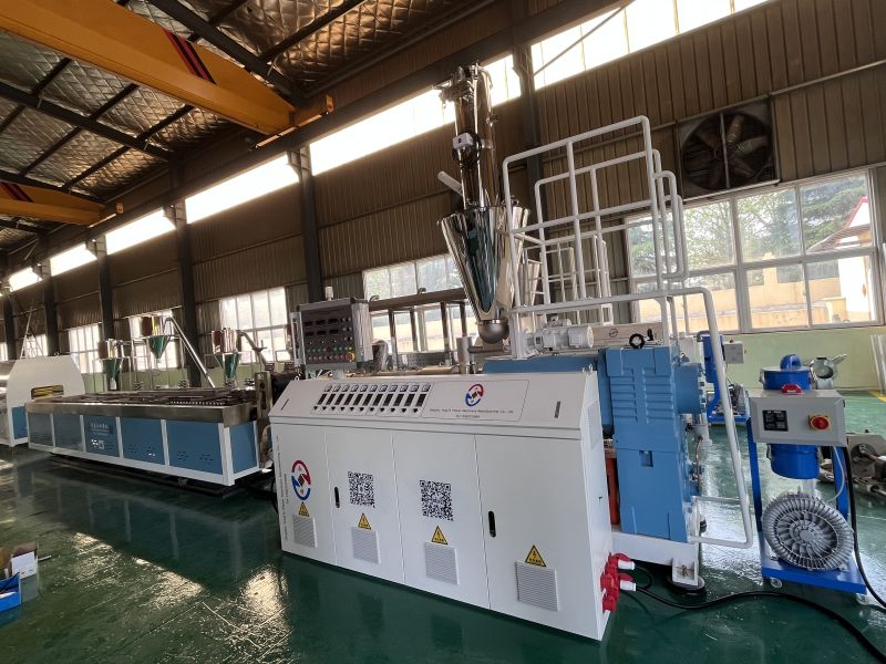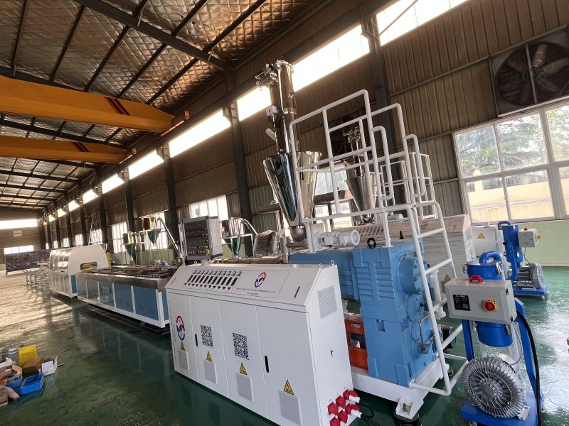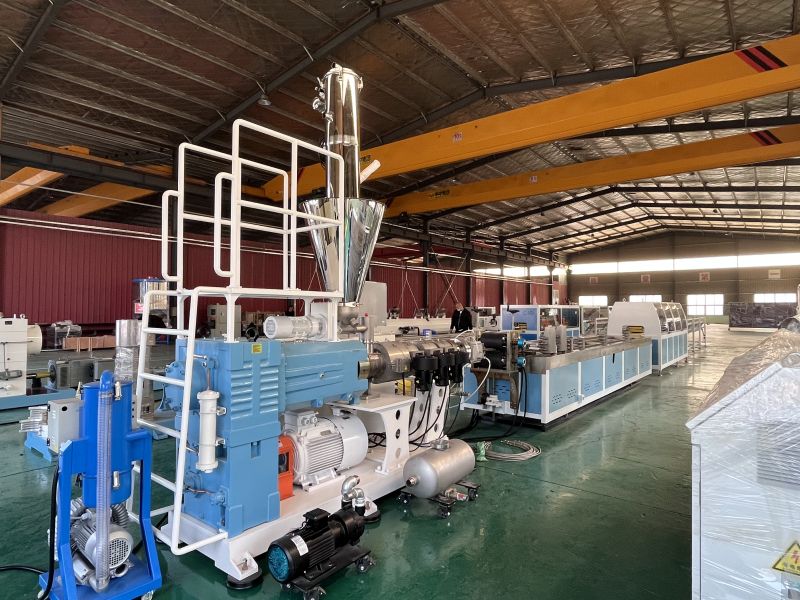 Mașina de extrudare a profilului WPC este compusă de alimentator automat, extruder conic cu șurub dublu, matriță și matriță, mașină de răcire și calibrare, tractor și tăietor și sistem de control electric. Granulele WPC sunt alimentate în buncărul extruderului. Extruderul plasticizează amestecul prin temperatură și presiune ridicată, apoi îl extrudă printr -o matriță într -un profil al formei dorite. În cele din urmă, după răcire și tăiere, se obține profilul din plastic din lemn finisat. Co-extruzarea este opțională pentru creșterea produselor WPC mai bune cu strat anti-vreme.